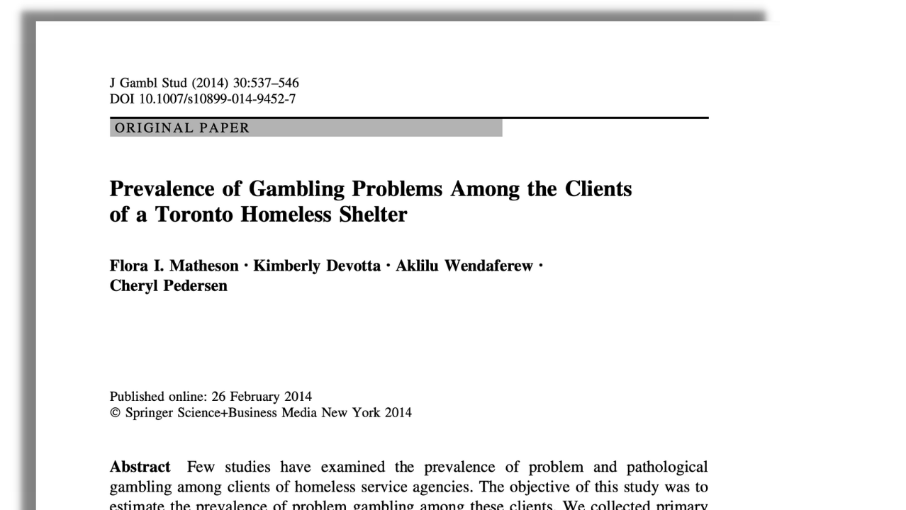 Gambling occurs at a very high rate among people experiencing poverty and homelessness. In fact, 35% of men and 28% of women using shelter services in Toronto and Hamilton reported serious gambling concerns.