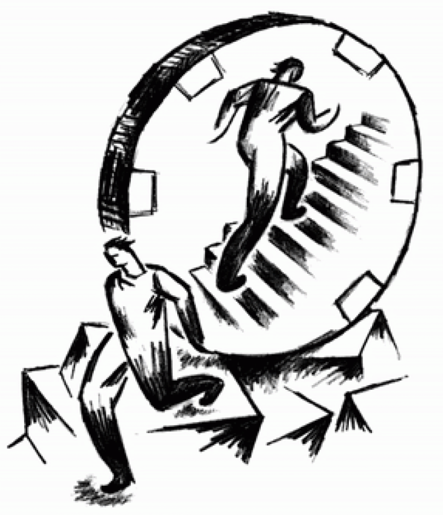 A note from the illustrator, Joe Fleming: It occurred to me how someone with a serious addiction must feel somewhat “sentenced,” bearing the weight of such a burden. I then compared this “weight” with the physical strain placed upon Sisyphus and thought it was a great metaphor. The massive boulder was replaced with a gambling chip, and the person inside the chip walking with ease up a set of stairs is to suggest that with hard work and help, this overbearing situation will get better/easier.